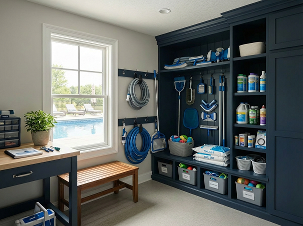 Built-in storage designed to keep towels, toys, and pool equipment organized, protected, and easy to access.